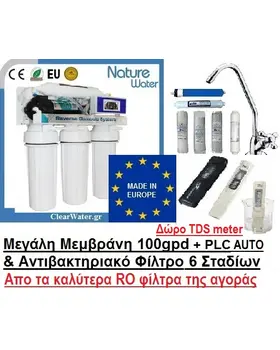 Αντιστροφη οσμωση 6 σταδιων με αντλία Οικιακής Χρήσης με μεγάλη μεμβράνη 100GPD + Pump Water System + mineralization + Αντιβακτηριακό φίλτρο + PLC Auto Flush System.